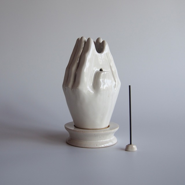 柔らかく閉じられた両手は、 祈りを捧げているのか、 願いを込めているのか、 香りをとらえようとしているのか。 合わせた手指の隙間から、煙の立ち上がる香炉です。 手型のお香立てが付属します。 土台部分は上下逆さにしてパロサント立てとしても。 写真は径4cmのキャンドルを中に入れています。 (点火中は手の部分が熱くなるのでお気をつけください。) 香炉は土台に乗せるだけの仕様です。 落下にお気をつけください。 香の種類により、灰が土台からはみ出たり自立しない場合があります。 ◆身体シリーズ 世界を認知する媒介である「身体」を題材としたシリーズです。 型を用いず一点ずつ土のかたまりから制作しています。 私達がひとりひとり異なるように、全て個性ある身体たちです。 サイズ (2点並びの写真は左から1, 2) 1 上部 幅 9cm × 高さ 14,5cm × 奥行き 7cm 下部 直径 7,5cm × 高さ 3cm 香立 幅 2,5cm × 奥行き 1,3cm × 高さ 0,8cm 重さ 639g 2 上部 幅 9cm × 高さ 15cm × 奥行き 7cm 下部 直径 8,5cm × 高さ 2,5cm 香立 幅 2,6cm × 奥行き 1,3cm × 高さ 0,7cm 重さ 615g (重さは上部、下部、香立3点合計) 素材 陶 ※お香によってついた汚れは、軽い汚れはアルコールを含むウェットティッシュなどで、しっかりついた汚れは食器用洗剤やメラニンスポンジ等で洗って頂けます。 ※土肌や貫入に染み込んだヤニ汚れは除去できません。風合いの変化をお楽しみください。 漂白剤は材質を傷める場合がありますのでご注意ください。 ご購入前に、下記をご一読いただきますようお願い申し上げます。 ▼ご注文時の注意事項/SHOPPING GUIDE▼ https://mosto2cera.theshop.jp/p/00001